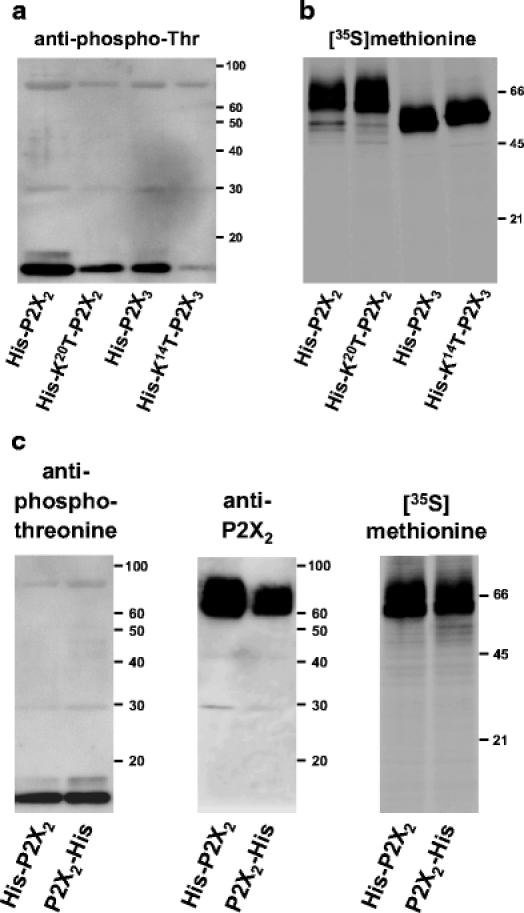 Fig. 3. Immunoblots show no constitutive phosphorylation of oocyte-expressed P2X2 or P2X3 receptors. The indicated wild-type or mutant P2X subunits were purified by Ni2+ chelate chromatography from [35S]methionine-labelled X. laevis oocytes and resolved by denaturing SDS-PAGE. a Shown is a representative immunoblot probed with a phosphothreonine-specific monoclonal antibody and a peroxidase-conjugated secondary antibody. No phosphorylation signal could be detected at the SDS-PAGE migration position of P2X2 and P2X3 subunits, which are indicated by the adjacent PhosphorImager scan in panel b. b Direct PhosphorImager visualization of metabolically [35S]methionine-labelled parent and mutant P2X subunits resolved by SDS-PAGE of the same samples as in panel a. cLeft panel: representative immunoblot of P2X2 subunits tagged with either an N-terminal or C-terminal hexahistidine sequence (designated His-P2X2 or P2X2-His, respectively) and probed with a phosphothreonine-specific monoclonal antibody and a peroxidase-conjugated secondary antibody. No phosphorylation signal could be detected at the SDS-PAGE migration position of P2X2 subunits, which were visualized by immunoblotting with the P2X2 subunit polyclonal antibody (middle panel) or PhosphorImager scanning of incorporated [35S]methionine (right panel)