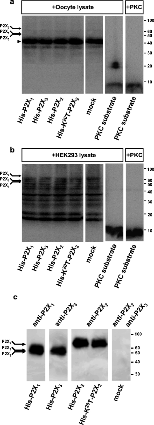 Fig. 5. Lysates of X. laevis oocytes or HEK293 cells contain endogenous PKC, but do not support PMA-driven phosphorylation of P2X2 or P2X3 receptors. The indicated wild-type and mutant P2X receptors were purified by non-denaturing Ni2+ chelate chromatography from X. laevis oocytes, supplemented with [γ-32P]ATP, 100 nM PMA and oocyte lysate (a) or HEK293 cell lysate (b), and incubated for 30 min at ambient temperature. In parallel, a peptide PKC substrate (final concentration 0.5 μg/μl) was incubated with [γ-32P]ATP, PMA and either of the two cell lysates or the purified rat brain PKC catalytic subunit as indicated. The proteins were resolved by reducing SDS-PAGE and visualized by phosphorimaging. Note that the band pattern was similar irrespective of whether protein of mock-injected oocytes or P2X receptor-expressing oocytes was used as a substrate, arguing against specific labelling of either P2X receptor. Arrows indicate migration positions of P2X1, P2X2 and P2X3 subunits. Arrowhead in a, dominant background band that is present in all oocyte samples. The peptide PKC substrate was similarly labelled by lysates or purified rat brain PKC, confirming the presence of endogenous PKC in X. laevis oocytes and HEK293 cells. c The same samples as in panels a and b were resolved on a separate SDS-PAGE gel. The indicated P2X subunits were detected by immunoblotting using the appropriate P2X subunit-specific polyclonal antibodies. A sample of mock-transfected cells was simultaneously probed with the P2X2 and P2X3 subunit-specific polyclonal antibodies
