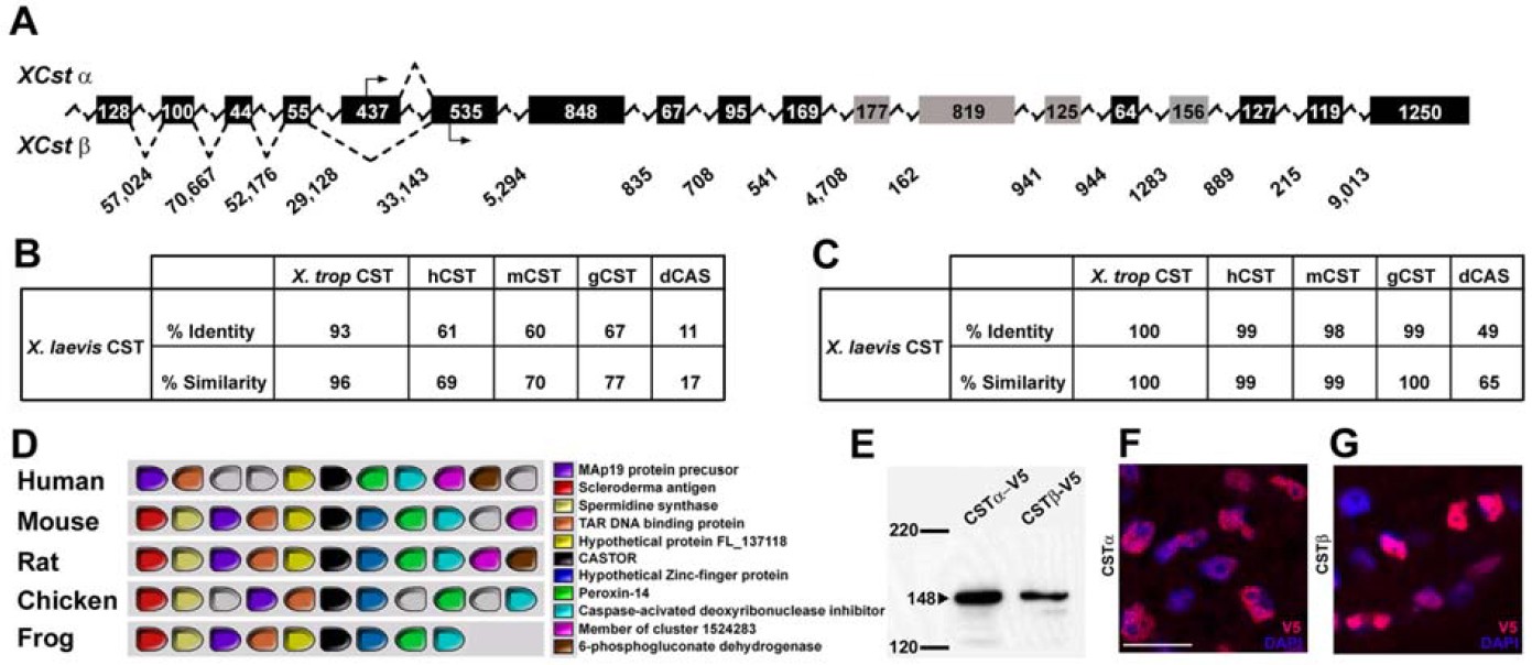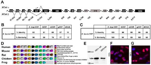 Figure S1. Identification and Characterization of Xenopus CST (A) Predicted genomic locus structure of Xenopus Cstα and Cstβ (5' to 3', not to scale). Exons are shown in boxes with the corresponding size given in basepairs. Exons in gray depict those containing the zinc finger repeats, and the sizes of intervening introns are indicated beneath each intron. Alternative splicing of the 5' regions is also indicated. (B,C) Table showing the evolutionary conservation of the full length CST amino acid sequence (B) and the zinc finger repeats (repeats 1-4) (C). The percentage of identical amino acids (identity) and the percentage of conservative substitutions (similarity) are given for comparison between CST proteins of X. tropicalis, hCST (human), mCST (mouse), predicted gCST (chicken), and dCAS (Drosophila). (D) Syntenic relationship between vertebrate Cst genomic loci using Metazome blast analysis. (E) Western blot analysis of CSTα-V5 and CSTβ-V5 in vitro translation. Both CST proteins run at the predicted size of 148 kDa. (F,G) CSTα and CSTβ cellular localization. Transverse confocal images of CSTα-V5 and CSTβ-V5 injected Xenopus embryos at Stage 32. Histological sections were stained with a V5 antibody (Red) to visualize the CST proteins and with DAPI (Blue) to identify the nucleus. Scale bar indicates 10μm. |