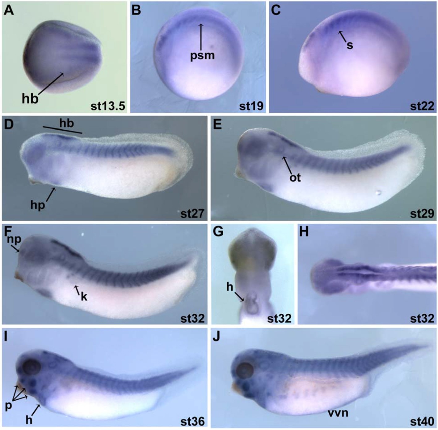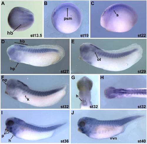 Figure S3. Xenopus tropicalis Cst Spatial Expression Whole mount in situ hybridization of Cst in X. tropicalis of Stage 14 (neurula) to Stage 40 (tadpole) embryos using a Cst-specific probe common to both Cstα and Cstβ. A is an anterior view. B-F, I-J are lateral views with anterior to the left. G is a ventral view with anterior to the top. H is a dorsal view with anterior to the left. hindbrain (hb), presomitic mesoderm (psm), somites (s), heart primordium (hp), otic vesicle (ot), nasal placode (np), facial placodes (p), heart (h), kidney (k), vascular vitelline network (vvn). |