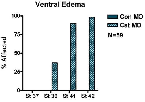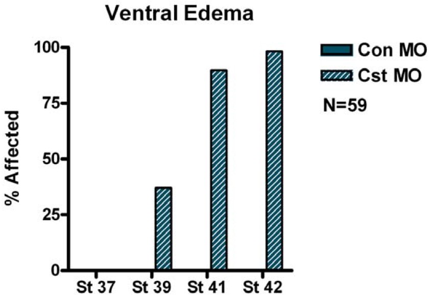 Figure S6. Statistics of Ventral Edema in CST-Depleted Embryos Distribution of incidences of ventral edema in control and CST-depleted embryos from Stage 37 to Stage 42. Graph represents one batch of 56 embryos. Analysis was performed with two independent experiments. |