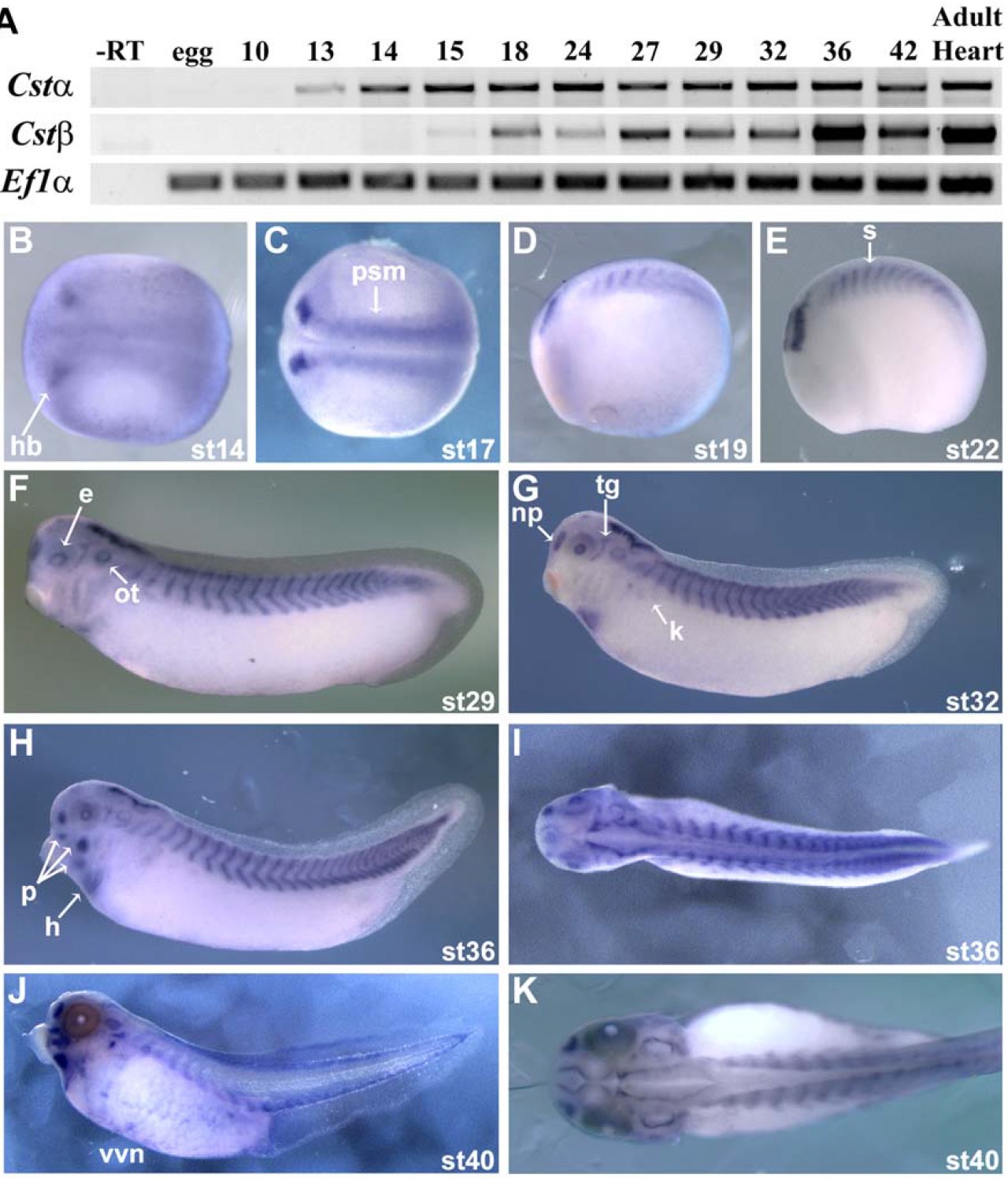 Figure S2. Xenopus laevis Cst Developmental and Spatial Expression (A) Developmental time course of X. laevis Cstα and Cstβ expression by RT-PCR of egg lysate (maternal transcripts), whole embryo ranging from Stage 10 (gastrulation) to Stage 42 (late tadpole), and adult heart. Ef1α is used as a positive control. (B-K) Whole mount in situ hybridization of Stage 14 (neurula) to Stage 40 (tadpole) embryos using a Cst-specific probe common to both Cstα and Cstβ. B,C are dorsal views with anterior to the left. D-H, and J are lateral views with anterior to the left: hindbrain (hb), presomitic mesoderm (psm), somites (s), heart primordium (hp), eye (e), otic vesicle (ot), nasal placode (np), trigeminal ganglion (tg), facial placodes (p), heart (h), kidney (k), vascular vitelline network (vvn). |