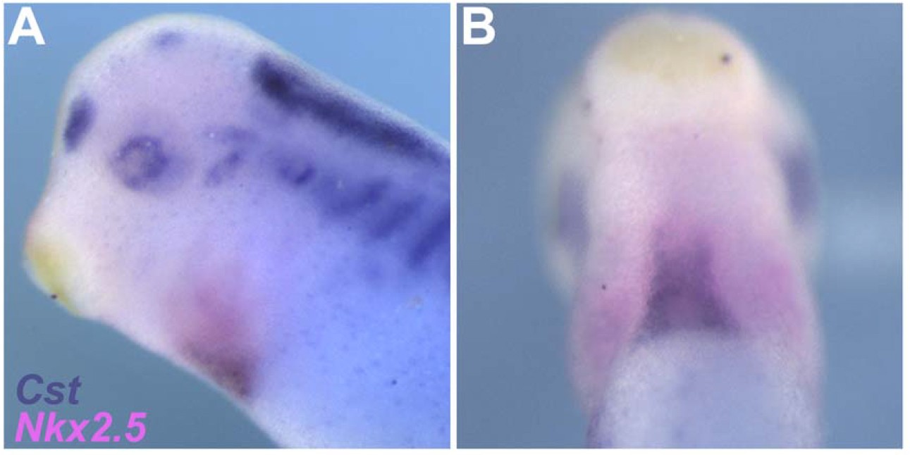 Figure S4. Xenopus Cst Is Expressed throughout the Linear Heart Tube Whole mount double in situ hybridization of Stage 29 embryos using a Nkx2.5-specific probe (pink) to mark the cardiac field and a Cst-specific probe (blue). Left panel is a lateral view with anterior to the left. Right panel is a ventral view with anterior to the top. |
