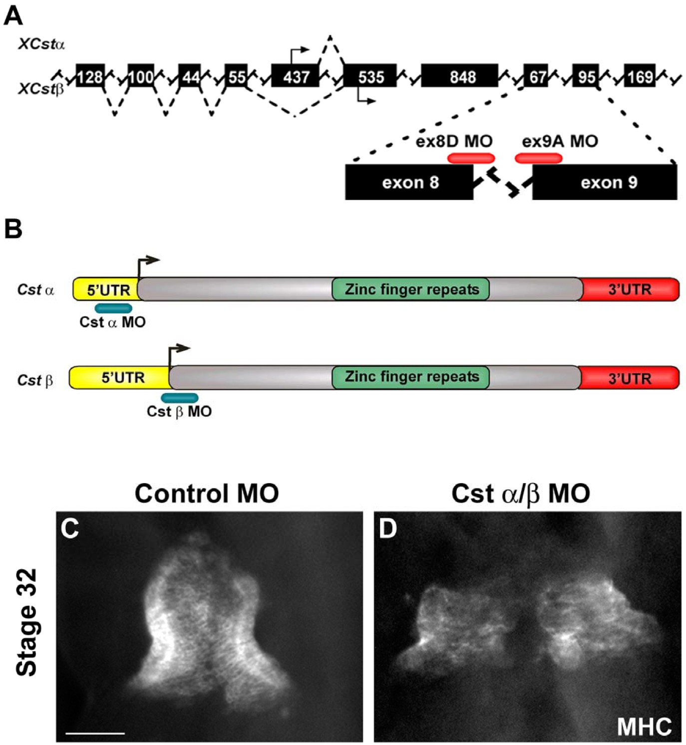 Figure S5. Morpholino Design and Phenotype (A) Position of the Cst splice junction morpholinos relative to the pre-mRNA transcripts targeting the donor the exon 8 (ex8D MO) and the acceptor of exon 9 (ex9A MO), referred collectively as CstMO. (B) Position of the Cst-5ⲠUTR morpholinos (red) relative to the Cstα and Cstβ cDNA transcripts. (C-D) Whole mount antibody staining with anti- MHC of Stage 32 control MO (C) and Cstα/β MO (D) embryos (ventral view) indicating an identical cardia bifida phenotype is obtained with both the CstMO (splice MO) as the Cstα/β MO (5ⲠUTR MO). Scale bar: C = 100 μm. |
