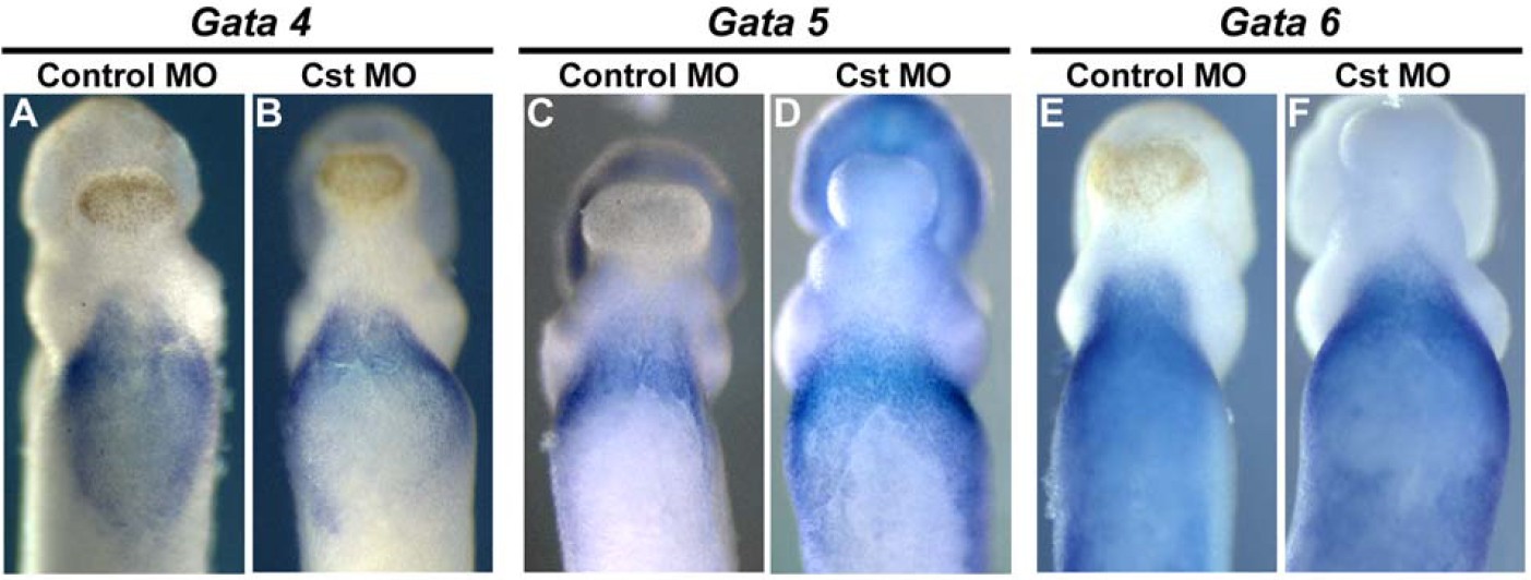 Figure S7. CST Is Not Required for Expression of Gata4, Gata5, or Gata6 Whole mount in situ hybridization of Stage 29 control MO and CST-depleted embryos demonstrating proper expression of (A,B) Gata4, (C,D) Gata5, and (E,F) Gata6. Ventral views with anterior to the top. |