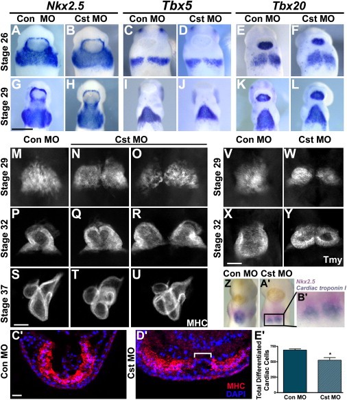 Figure 2. CST Is Required for Cardiomyocyte Differentiation at the Ventral Midline(AâL) Whole-mount in situ analysis with early cardiac markers Nkx2.5 (A, B, G, and H), Tbx5 (C, D, I, and J), and Tbx20 (E, F, K, and L) of tailbud Stage 26 and 29 control and CST-depleted embryos (ventral view with anterior to the top). Cardiac progenitors have properly migrated and completely fused across the ventral midline.(MâU) Whole-mount MHC antibody staining at Stage 29 (onset of cardiac differentiation), Stage 32 (completion of linear heart tube formation), and Stage 37 (chamber formation) (ventral view with anterior to the top). (M) Stage 29 control MO embryos and (N and O) CST-depleted embryos. (P) Stage 32 control MO embryos and (Q and R) CST-depleted embryos display varying degrees of cardia bifida of the linear heart tube upon CST depletion. (S) Stage 37 control MO embryos and (T and U) CST-depleted embryos display morphological consequences of CST depletion on chamber formation.(VâY) Whole-mount Tmy antibody staining of Stage 29 and 32 (V and X) control MO and (W and Y) CST-depleted embryos demonstrates that lack of differentiation is not specific to MHC. (ZâBâ²) Simultaneous detection of cardiac progenitor cells and differentiated cardiac cells in a Stage 29 CST-depleted embryo.(Z and Aâ²) Whole-mount double in situ analysis using a Nkx2.5-specific probe (pink) to mark cardiac progenitor cells and Cardiac troponin I-specific probe (blue) to mark differentiated cardiac cells in (Z) control MO and (Aâ²) CST-depleted embryos.(Bâ²) Magnified image of the cardiac region in the CST-depleted embryo in (Aâ²).(Câ² and Dâ²) Transverse sections of Stage 29 (Câ²) control MO and (Dâ²) CST-depleted embryos stained with MHC antibody and DAPI. Brackets highlight the lack of differentiation at the ventral midline.(Eâ²) Quantification of differentiated cardiomyocytes determined by counting the total MHC-positive cells derived from serial sectioned embryos. Bars represent the average of at least six embryos per condition ± SEM; âp < 0.01. Representative images are derived from a single experiment, and all experiments were repeated at least twice with independent batches of embryos. Scale bars: (G) = 0.5 mm, (S and X) = 100 μm, (Câ²) = 200 μm. |