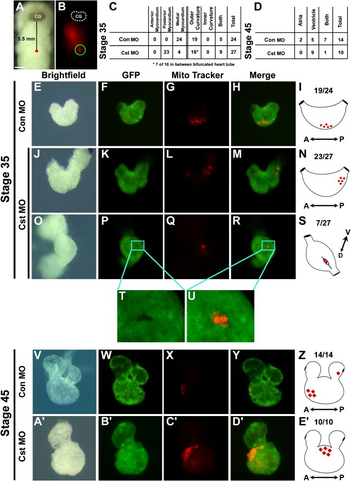 Figure 4. Fate Mapping Cardiac Ventral Midline Cells(A) Bright-field image of a living cardiac actin-GFP transgenic embryo injected with MitoTracker at Stage 29 along the ventral midline 5.5 mm posterior to the cement gland (CG). (B) Fluorescent image of the same embryo demonstrating the location of incorporated MitoTracker into cells at the ventral midline (ventral views with anterior to the top). Fluorescence anterior to site of injection is reflection off the surface of the live embryo. (C and D) Tabulation of the location of MitoTracker-labeled cardiac cells of control MO and CST-depleted embryo at (C) midtailbud Stage 35 and (D) tadpole Stage 45. Images of CA-GFP transgenic control MO-injected and CST-depleted (EâH, JâM, and OâU) Stage 35 and (VâY and Aâ²âDâ²) Stage 45 dissected hearts. (F, K, P, T, U, and Z) Corresponding images of GFP expression. (G, L, Q, X, and Câ²) Corresponding images of fated MitoTracker-labeled cardiac ventral midline cells. (H, M, R, U, Y, and Dâ²) Merged images of GFP and fated MitoTracker-labeled ventral midline cells. (T and U) Note the fated ventral midline cells in a pocket of undifferentiated (GFP-negative) cardiomyocytes. (I, N, S, Z, and Eâ²) Schematics representing fate of the cardiac ventral midline cells to the outer curvature of the ventricle in (I) Stage 35 and (Z) Stage 45 control MO-injected hearts. CST-depleted fated ventral midline cells located in the (N) posterior midline or (S) in an undifferentiated cleft in the outer ventricular myocardium in Stage 35 CST-depleted hearts and (Eâ²) in a condensed mass of cells on the outer ventricle in Stage 45 CST-depleted hearts. |