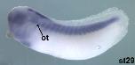 casz1 (castor zinc finger 1) gene expression in Xenopus tropicalis embryo, assayed via in situ hybridization, NF stage 22, lateral view, dorsal up, anterior left. |