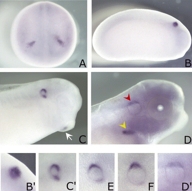 Fig. 4. Whole-mount in situ hybridization analysis of XHas3 expression pattern during Xenopus development. (A) At stage 18, XHas3 is exclusively detectable in the otic placodes. (B) A lateral view of a stage 23 embryo. (C) A stage 26 embryo. XHas3 is expressed in the otic vesicle and in the posterior half of the cement gland (arrow). (D) Stage 37/38 embryo. XHas3 is still present in the otic vesicle (red arrowhead) and appears in the pronephric glomerula (yellow arrowhead). Time course expression analysis of XHas3 in the early inner ear development. (Bâ²) Stage 23, (Câ²) stage 26: XHas3 labelling signal is higher at the dorsal and ventral sides of the otic vesicle. (E,F,Dâ²) Stage 30, 33/34 and 37/38: XHas3 mRNA gradually disappears from the ventral part of the otic vesicle walls, remaining localized at the dorsal side.