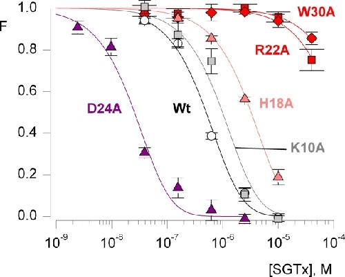 The venom from spiders, scorpions, and sea anemone contain a rich diversity of protein toxins that interact with ion channel voltage sensors. Although atomic structures have been solved for many of these toxins, the surfaces that are critical for interacting with voltage sensors are poorly defined. Hanatoxin and SGTx are tarantula toxins that inhibit activation of K(v) channels by interacting with each of the four voltage sensors. In this study we set out to identify the active surface of these toxins by alanine-scanning SGTx and characterizing the interaction of each mutant with the K(v)2.1 channel. Examination of the concentration dependence for inhibition identified 15 mutants with little effect on the concentration dependence for toxin inhibition of the K(v)2.1 channel, and 11 mutants that display moderate to dramatic perturbations. Mapping of these results onto the structure of SGTx identifies one face of the toxin where mutations with pronounced perturbations cluster together, and a backside of the toxin where mutations are well tolerated. The active surface of SGTx contains a ring-like assembly of highly polar residues, with two basic residues that are particularly critical, concentrically arranged around a hydrophobic protrusion containing critical aliphatic and aromatic residues. These results identify the active surface of the toxin and reveal the types of side chains that are important for interacting with voltage sensors.