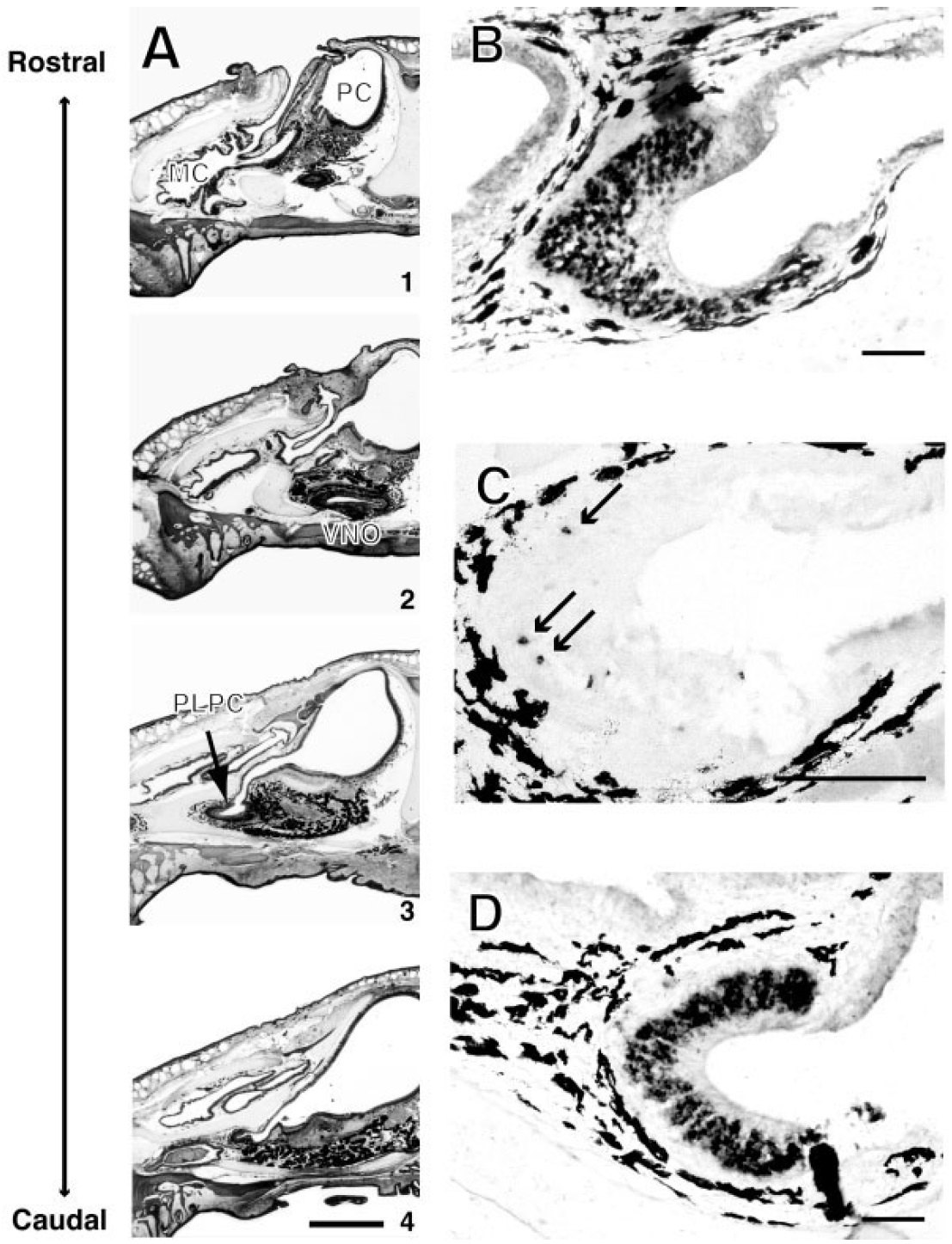 v2rc-1 (vomeronasal receptor C-1) gene expression in Xenopus laevis embryo, assayed via in situ hybridization, NF stage 66, sagittal sections of the olfactory region.