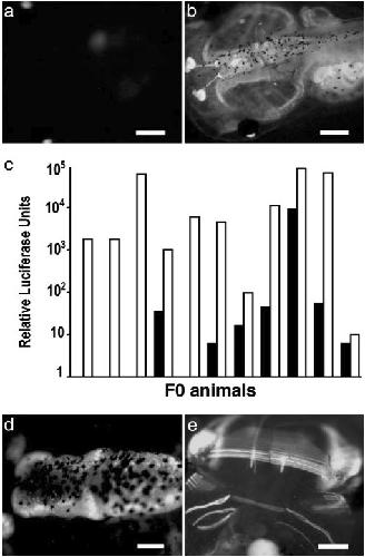 Fig 2. Inducibility and tissue-specific expression of the Tet system in trans- genic Xenopus F0 and F1 tadpoles. Expression of the GFP reporter gene in a 1-week-old F0 transgenic animal before (a) and after (b) 12 h of treatment with 5 ug/ml Dox. (c) Luciferase activity in the tail extracts of 11 different F0 transgenic animals before (solid bar) and after (open bar) induction with 5 ug/ml Dox for 48 h. Tissue-specific expression in 1-week-old tadpoles induced with 5 ug/ml Dox using the NBetaT (d) and cardiac actin (e) promoters driving inducible GFP. [Bars = 500 um (a, b, and e) and 200 um (d).]