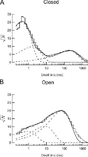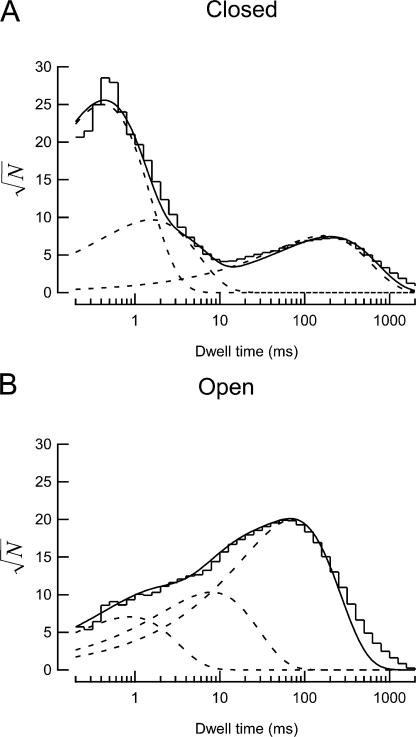Figure 2. Example dwell-time histograms of single channel recordings. (A) Dwell-time histogram of the closed states of a single MEC-4d/10d + MEC-2 + MEC-6 channel. (B) Dwell-time histogram of the open states of the same channel as in A. For optimal visual estimation of fit quality (Sigworth and Sine, 1987), dwell times are accumulated into logarithmic bins and displayed with a square-root ordinate. Solid lines are fits to the data with the sum of three exponential functions, dotted lines represent each exponential component.