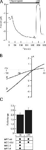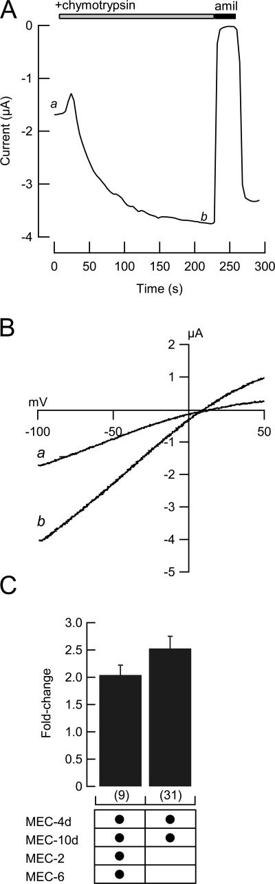 Figure 4. Activation by extracellular chymotrypsin. (A) Example time course of chymotrypsin-evoked current increase in an oocyte expressing MEC-4d/10d + MEC-2 + MEC-6. a and b indicate when the curves shown in B were collected. Current amplitude was measured every 4 s at −85 mV. (B) Whole-cell I-V relationship before (a) and during chymotrypsin application (b). In all cases, chymotypsin-evoked current was blocked by amiloride (300 μM). (C) Chymotrypsin-evoked increase in the amiloride-sensitive current in the presence and absence of MEC-2 and MEC-6.