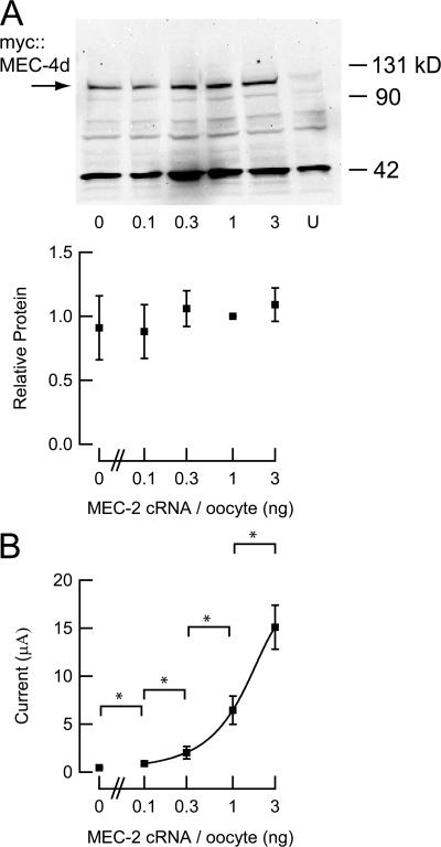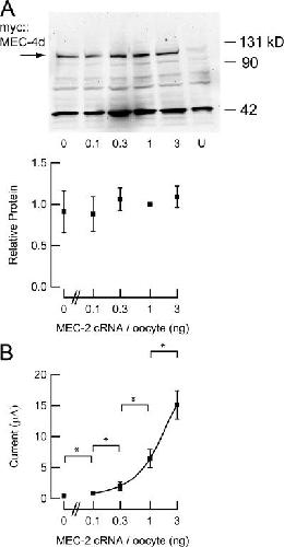 Figure 5. Surface expression and current amplitude as a function of MEC-2 cRNA. (A) Surface expression of myc∷MEC-4d in oocytes coexpressing myc∷MEC-4d, MEC-10d, MEC-2, and MEC-6 (top). The amount of MEC-2 cRNA is indicated below each lane; U indicates uninjected (control) oocytes. Relative surface expression as a function MEC-2 cRNA (bottom), normalized to density with 1 ng MEC-2 cRNA per oocyte. Data represent the results of three independent Western blots. Nonspecific bands are observed in all blots and are visible in uninjected cells. (B) Amiloride-sensitive currents recorded from oocytes analyzed in parallel with those used for Western blotting in A. Stars indicate significance P < 0.01 (Student's t test). Smooth line is fit to the data according to: I = I0 + (Imax − I0)(1 + [MEC-2 cRNA]/EC50)−1. The EC50 is 2.8 ng, IO = 0.48 μA.