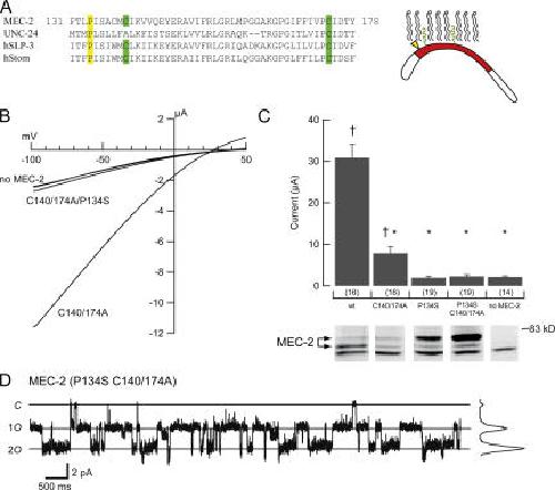 Figure 6. Characterization of cholesterol-binding mutants of MEC-2. (A) Alignment of selected PHB family members. MEC-2 and UNC-24 are coexpressed in vivo. MEC-2 is also represented schematically on the right. In yellow, P134, required for cholesterol binding. In green, C140 and C174 required for palmitoylation (Huber et al., 2006). (B) I-V relationship of channels lacking MEC-2, containing MEC-2 double mutant, and MEC-2 triple mutant. MEC-2(P134S) single mutant currents are essentially indistinguishable from the triple mutant and are omitted for clarity. (C) Average currents recorded from MEC-2 mutant-expressing cells (top). Bars are mean ± SEM. Sample size is indicated in parentheses below each bar. â , P < 0.005, compared with the absence of MEC-2; *, P < 10â6 compared with wild-type MEC-2. Western blot of MEC-2 isoforms (bottom). For clarity, lanes corresponding to each isoform are aligned with the data in A. All lanes were from the same blot (with identical contrast manipulation). Similar results were obtained in a total of three independent experiments. (D) Single-channel activity from an outside-out patch of a cell expressing triple mutant MEC-2. These data were used to measure single-channel conductance. Solid lines indicate zero, one or both channels open; all-points histogram is shown on the right.