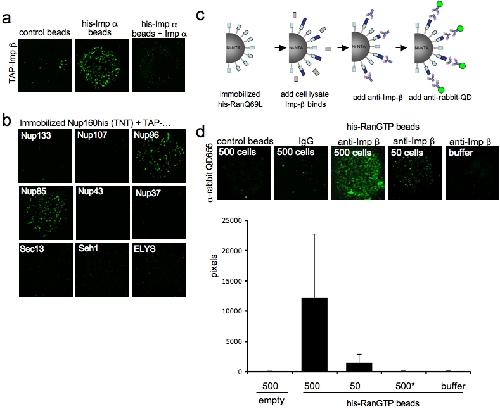 Figure 2. Using SINBAD as pull-down method with increased sensitivity.(A) Approx. 10 Ni-NTA beads were incubated with reticulocyte lysates containing his-Importin α or his- Importin α together with in vitro translated TAP-Importin β(wt) in the presence or absence of excess Importin α. QD655 were added, beads were isolated and imaged. (B) his-Nup160 was translated in reticulocyte lysates and incubated with equal volume (2 ul) of in vitro translated Nup133-TAP, Nup107-TAP, Nup96-TAP, Nup85-TAP, Nup43-TAP, Nup37-TAP, Seh1-TAP, Sec13-TAP and ELYS-TAP for 30 min. Approx. 5 Ni-NTA beads were added together with streptavidin-coated QDs655 and imaged by confocal microscopy on the bead surface. (C) Schematic illustration of SINBAD for the pull-down of endogenous proteins. (D) Hypotonic cell lysates corresponding to 500 or 50 cells were incubated with Ni-NTA beads coated with his-RanQ69L. Bound endogenous Importin β was visualized as described in (C). (E) Random 10 µm2 areas were imaged and fluorescence intensity at 655 nm was plotted. n = 20.