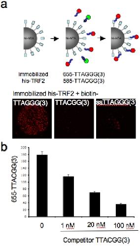 Figure 3. SINBAD for the detection of protein-DNA interactions.(A) his-TRF2 was immobilized on Ni-NTA beads and incubated with hybridized 5′-biotinylated DNA oligos containing three repeats of TTAGGG (red), a mutant TTACGG or ssTTAGG as indicated. Bound DNA was visualized with streptavidin-coated QDs655. (B) <10 his-TRF2 Ni-NTA beads bound to wild-type telomere sequence were incubated with increasing concentrations of competitor DNA oligos. Fluorescence intensity of QD655 was determined from confocal images and plotted.