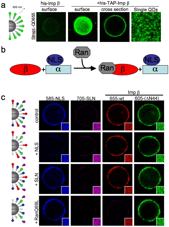 Figure 1. Monitoring protein interactions on a single affinity chromatography bead.(A) 1 µM recombinant his-TAP-tagged Importin β(wt) was immobilized on 5 ul magnetic Ni-NTA beads for 20 min. After the addition of 5 nM CdSe-ZnS core shell QD655 beads were washed and isolated with a magnet. Beads were recovered in 2 ul PBS, mounted on a glass slide and the bead surface was imaged by confocal microscopy. (B) Schematic illustration of the RanGTP (gray) dissociation of Importin β (red) from Importin α (light blue). (c) QD585 cross-linked to NLS peptide (blue), QD705 cross-linked to reverse NLS (SLN) (magenta), streptavidin-coated QD655-TAP-Importin β(wt) (red) and streptavidin-coated QD605-TAP-Importin β(ΔN44) (green) were incubated with his-Importin α coated Ni-NTA beads in the presence of buffer (control), 20 mM NLS or SLN peptides or 10 mM RanQ69L.