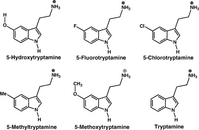Antagonists, but not agonists, of the 5-HT3 receptor are useful therapeutic agents, and it is possible that partial agonists may also be potentially useful in the clinic. Here we show that 5-fluorotryptamine (5-FT) is a partial agonist at both 5-HT3A and 5-HT3AB receptors with an Rmax (Imax/Imax 5-HT) of 0.64 and 0.45 respectively. It is about 10 fold less potent than 5-HT: EC50=16 and 27 microM, and Ki for displacement of [3H]granisetron binding=0.8 and 1.8 microM for 5-HT3A and 5-HT3AB receptors respectively. We have also explored the potencies and efficacies of tryptamine and a range of 5-substituted tryptamine derivatives. At 5-HT3A receptors tryptamine is a weak (Rmax=0.15), low affinity (EC50=113 microM; Ki=4.8 microM) partial agonist, while 5-chlorotryptamine has a similar affinity to 5-FT (EC50=8.1 microM; Ki=2.7 microM) but is a very weak partial agonist (Rmax=0. 0037). These, and data from 5-methyltryptamine and 5-methoxytryptamine, reveal the importance of size and electronegativity at this location for efficient channel opening.