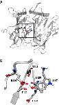 Fig. 4. 5-HT docked into a homology of the 5-HT3 receptor (Reeves et al., 2003). A. The extracellular domains of two subunits of the 5-HT3 receptor showing the location of the binding pocket (boxed) at their interface. B. Enlarged image of the binding site showing the proximity of the hydroxyl group of 5-HT to the hydrophilic residues Asn128, Glu129 Thr179, Thr181 and Glu236.
