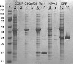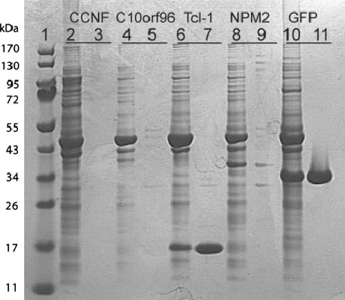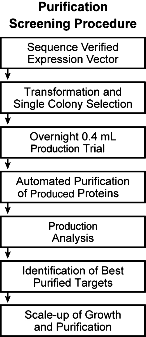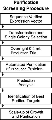 A simple approach that allows cost-effective automated purification of recombinant proteins in levels sufficient for functional characterization or structural studies is described. Studies with four human stem cell proteins, an engineered version of green fluorescent protein, and other proteins are included. The method combines an expression vector (pVP62K) that provides in vivo cleavage of an initial fusion protein, a factorial designed auto-induction medium that improves the performance of small-scale production, and rapid, automated metal affinity purification of His8-tagged proteins. For initial small-scale production screening, single colony transformants were grown overnight in 0.4 ml of auto-induction medium, produced proteins were purified using the Promega Maxwell 16, and purification results were analyzed by Caliper LC90 capillary electrophoresis. The yield of purified [U-15N]-His8-Tcl-1 was 7.5 microg/ml of culture medium, of purified [U-15N]-His8-GFP was 68 microg/ml, and of purified selenomethione-labeled AIA-GFP (His8 removed by treatment with TEV protease) was 172 microg/ml. The yield information obtained from a successful automated purification from 0.4 ml was used to inform the decision to scale-up for a second meso-scale (10-50 ml) cell growth and automated purification. 1H-15N NMR HSQC spectra of His8-Tcl-1 and of His8-GFP prepared from 50 ml cultures showed excellent chemical shift dispersion, consistent with well folded states in solution suitable for structure determination. Moreover, AIA-GFP obtained by proteolytic removal of the His8 tag was subjected to crystallization screening, and yielded crystals under several conditions. Single crystals were subsequently produced and optimized by the hanging drop method. The structure was solved by molecular replacement at a resolution of 1.7 A. This approach provides an efficient way to carry out several key target screening steps that are essential for successful operation of proteomics pipelines with eukaryotic proteins: examination of total expression, determination of proteolysis of fusion tags, quantification of the yield of purified protein, and suitability for structure determination.