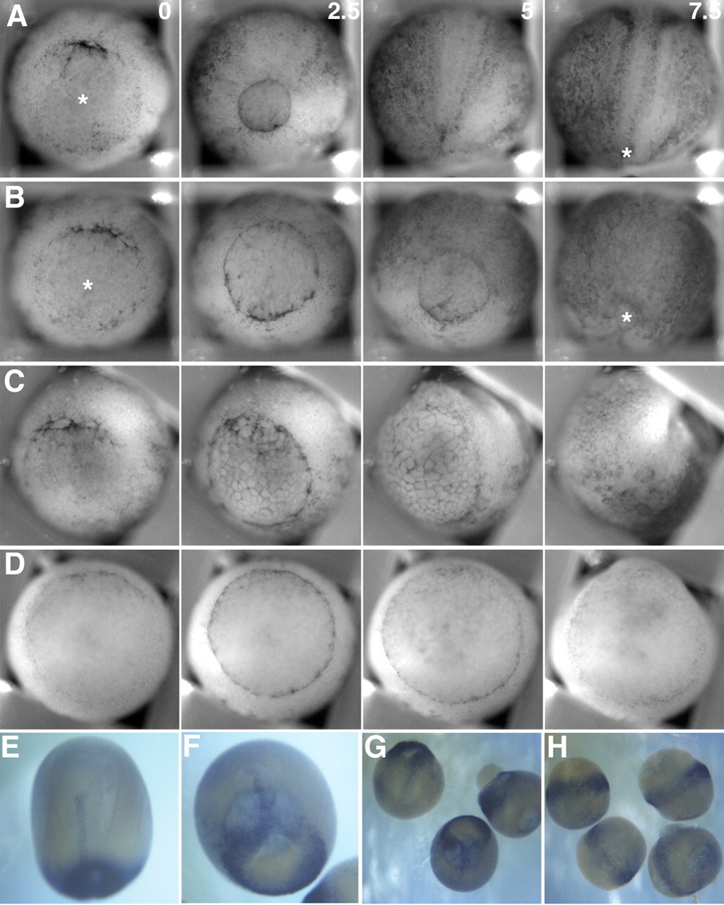 Fig. 3. Myosin IIB MO-mediated failure of gastrulation is dose dependent. (A-D) Still images from simultaneous time-lapse videorecordings showing vegetal views of control (A) and morphant Xenopus embryos injected with 2.5 μM (B), 5 μM (C) and 10 μM (D) MHC-B MO. Embryos are oriented with their dorsal side up. At stage 10 (t=0), bottle cells form in the dorsal lip of the blastopore of all control and morphant embryos. By control stage 12 (t=2.5), ventral bottle cells have formed in all control and morphant embryos, but blastopore closure is delayed in a MHC-B MO dose-dependent manner. The site of blastopore closure in 2.5 μM (B, t=7.5) morphant embryos is not located as ventrally as in control embryos (A, t=7.5). Asterisks indicate the center of the yolk plug at t=0 and the point of blastopore closure at t=7.5. (E-H) RNA in situ hybridizations of stage-13 embryos for brachyury expression reveals the extent of notochordal morphogenesis in a control embryo (E), and reduced notochordal morphogenesis in a 5 μM morphant (F). The 5μ M morphant embryos exhibit some variability in notochordal extension (G), but 10 μM morphant embryos essentially lack notochord extension (H).