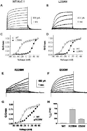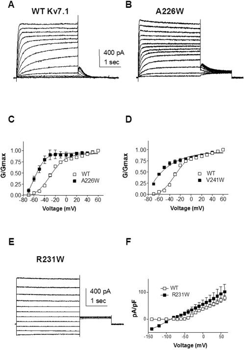 Figure 2. Mutations stabilizing Kv7.1 to the open state.(A) and (B) Representative current traces of WT and A226W, respectively. From a holding potential of −90 mV, the membrane was stepped for 3 s from −70 mV to +60 mV in 10 mV increments and then repolarized for 1.5 s to −60 mV to generate the tail currents. (C) and (D) Normalized conductance was plotted as a function of step voltages, for the mutants (black squares) A226W (n = 6) and V241W (n = 11), respectively, and compared to WT (n = 20) (open squares). The activation curves were fitted using one Boltzmann function. (E) Representative current traces of R231W. Membrane was stepped for 3 s from −140 mV to +60 mV in 20 mV increments and then repolarized for 1.5 s to −60 mV. (F) Current-voltage relations of R231W (n = 8) (black squares) and WT (open squares). Current density (pA/pF) was plotted as a function of step voltages.