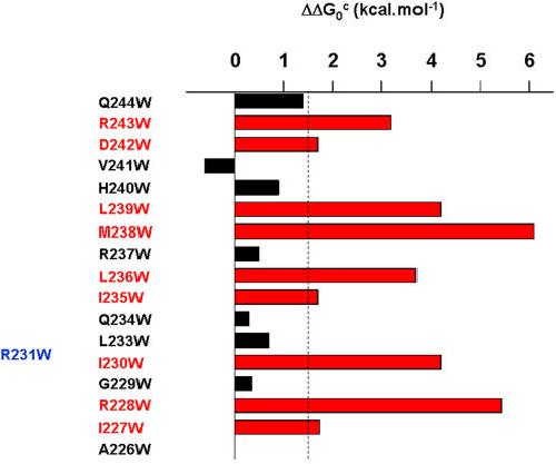 Figure 5. Summary of the tryptophan scan of Kv7.1 S4 in the presence of KCNE1.The cut-off for significance was ∥ΔΔG0c∥≥1.5 kcal.mol−1. The red and blue bars of the mutated residues shift the gating equilibrium in favor of the closed and open state, respectively. The black bars correspond to residues whose perturbation is not significant (∥ΔΔG0c∥<1.5 kcal.mol−1).