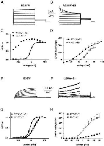 Figure 7. Effect of KCNE1 co-expression with mutant R231W and I235W.Representative current traces of mutant R231W expressed without (A) or with KCNE1 (B). Conductance-voltage relations (C) and current-voltage relations (D) of WT Kv7.1 and mutant R231W co-expressed with KCNE1. Representative current traces of mutant I235W expressed without (E) or with KCNE1 (F). Conductance-voltage relations (G) and current-voltage relations (H) of WT Kv7.1 and mutant I235W co-expressed with KCNE1.