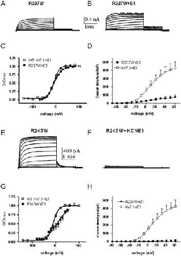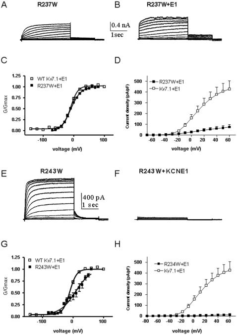 Figure 8. Effect of KCNE1 co-expression with mutant R237W and R243W.Representative current traces of mutant R237W expressed without (A) or with KCNE1 (B). Conductance-voltage relations (C) and current-voltage relations (D) of WT Kv7.1 and mutant R237W co-expressed with KCNE1. Representative current traces of mutant R243W expressed without (E) or with KCNE1 (F). Conductance-voltage relations (G) and current-voltage relations (H) of WT Kv7.1 and mutant R243W co-expressed with KCNE1.
