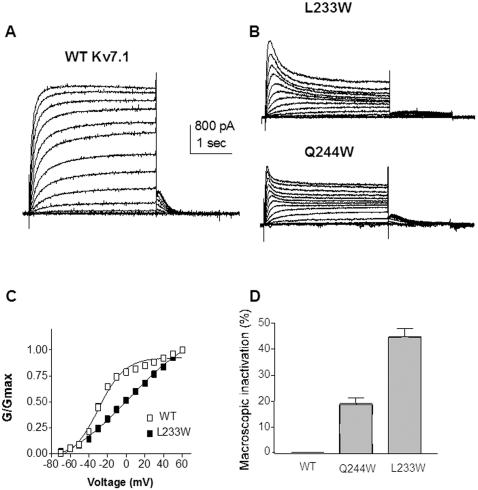 Figure 4. Mutations stabilizing KCNQ1 towards the inactivated state.(A) and (B) Representative current traces of WT and L233W and Q244W, respectively, recorded as in Figure 2 A. (C) Normalized conductance of L233W (n = 13) (black squares), compared to WT (open squares). (D) Percent of macroscopic inactivation of WT, Q244W and L233W (n = 7–20) as measured by the ratio between the sustained and the peak current amplitudes.