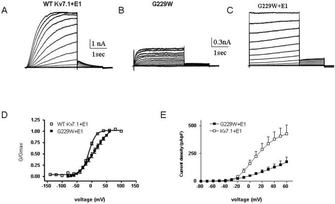 Figure 6. Effect of KCNE1 co-expression with mutant G229W.Representative current traces of WT IKS (A) and mutant G229W expressed without (B) or with KCNE1 (C). From a holding potential of −90 mV, the membrane was stepped for 3 s from −70 mV to +60 mV in 10 mV increments and then repolarized for 1.5 s to −60 mV to generate the tail currents. Conductance-voltage relations (D) and current-voltage relations (E) of WT Kv7.1 and mutant G229W co-expressed with KCNE1.