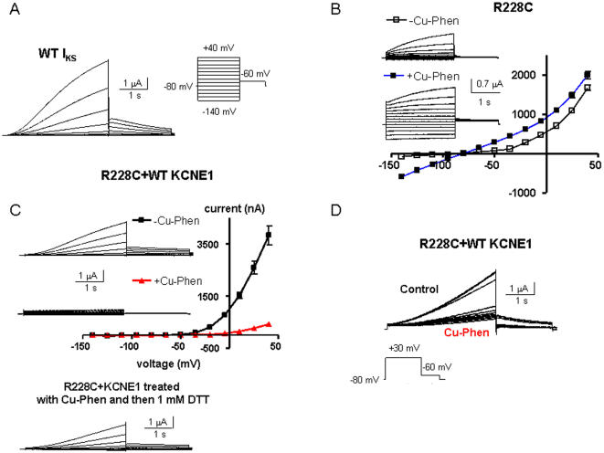 Figure 9. Impact of KCNE1 expression on WT Kv7.1 and mutant R228C.(A) Representative trace of WT Kv7.1 coexpressed with WT KCNE1. (B) Effects of external Cu-Phen on mutant R228C. Oocytes were bathed in ND96 in the absence and presence of 100 µM Cu-Phen. Shown are representative traces and current-voltage relations were determined as indicated. (C) Shown are representative traces and current-voltage relations of R228C+WT KCNE1 channels, when oocytes were bathed with ND96 in the absence of presence of 100 µM Cu-Phen. Also shown, is the reversal by DTT of the current decrease produced by Cu-Phen. (D) Representative traces of R228C+WT KCNE1 channels, when oocytes were bathed with ND96 containing 100 µM Cu-Phen. Currents were evoked by a train of step depolarization to +30 mV. Similar results have been obtained in 5 other cells.