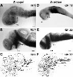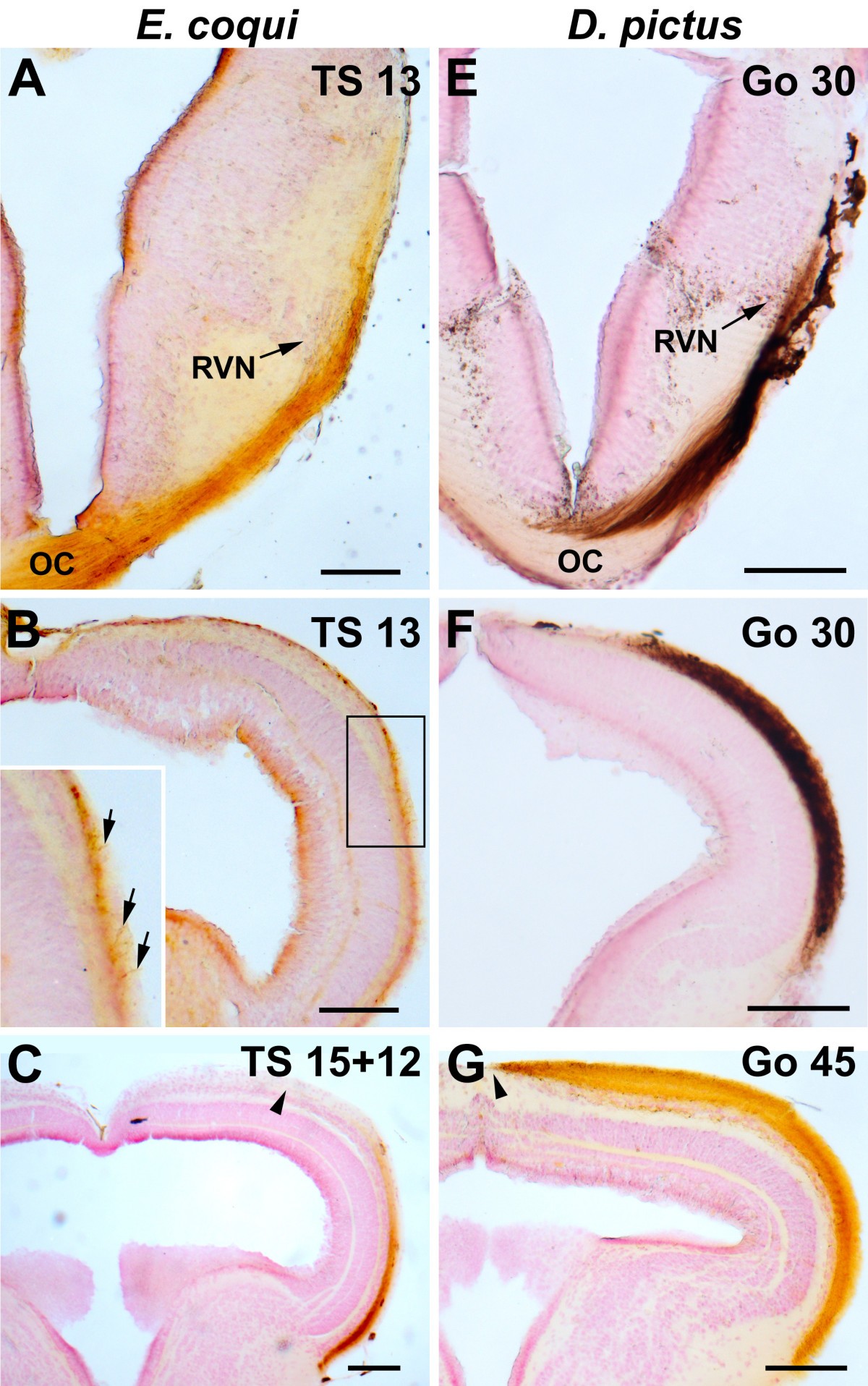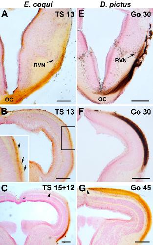 Figure 6. Contralateral retinotectal projections in E. coqui (A-C) and D. pictus (D-F) as revealed by biocytin tracing. At two days before hatching, the optic projections of E. coqui (A, B) resemble early larvae of D. pictus (E, F). After crossing in the optic chiasm (OC) the majority of retinofugal fibers forms the marginal optic tract, which courses dorsally in the thalamus and forms a first terminal field in the rostral visual nucleus (RVN; this probably corresponds to the nucleus lateralis of [32]) (A, E). Retinofugal fibers extend further until the optic tectum and cover approximately its rostral half (B, F). In E. coqui, the density of optic fibers on the tectal surface (see arrows in magnified inset of B) is much sparser than in D. pictus. At 12 days after hatching, optic fibers have reached the caudal end of the tectum in E. coqui, but do not yet extend towards its midline (C: section through midtectum; arrowheads indicate medial limit of coverage). In contrast, optic fibers cover the entire tectum in D. pictus at the end of metamorphic climax (G: section through midtectum). Bar: 100 μm in all panels. |