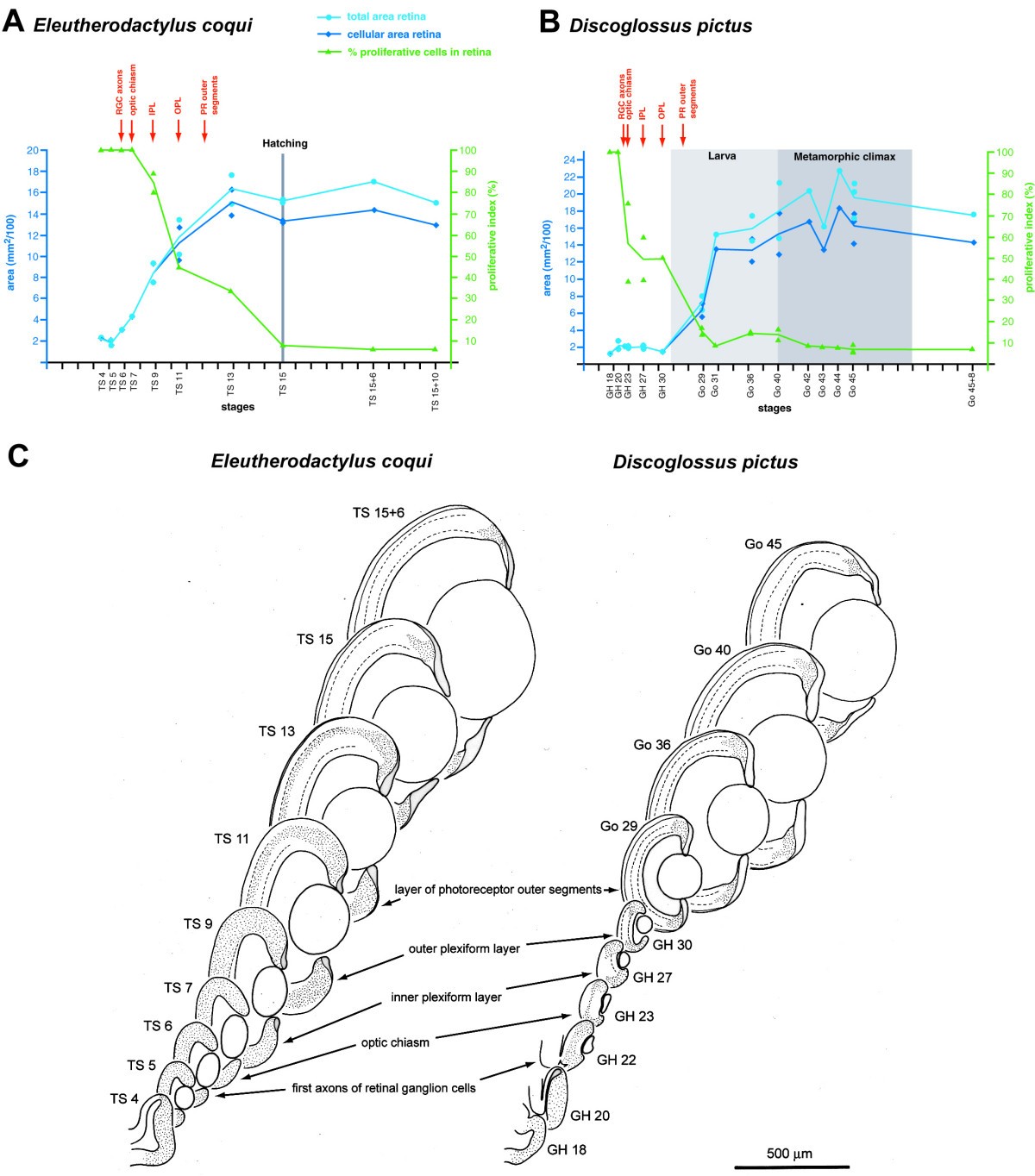 Figure 2. Retinal development in E. coqui and D. pictus. (A, B) Morphometric analysis of retinal development (modified from [29]). Cross-sectional area of the central retina (light blue) or of its cellular layer (dark blue) is plotted against developmental age. In addition, a proliferative index indicating the PCNA positive proportion of the cellular layer is shown in green. Each symbol represents a measurement from a single individual (there are less data points for the proliferative index than for area measurements because PCNA staining was not apparent in each individual). Curves are drawn through mean values in case more than one individual per stage was analyzed. For each species, timing of first outgrowth of axons from retinal ganglion cells (RGC), the first retinofugal fibers in the optic chiasm, the formation of inner and outer plexiform layers (IPL and OPL, respectively) and of a distinct layer of photoreceptor (PR) outer segments in the retina are indicated in red. For D. pictus the approximate duration of larval and metamorphic phases are emphasized, while for E. coqui, which lacks a free-living larva, the time of hatching is shown (at hatching, E. coqui corresponds to frogs at the end of metamorphosis with respect to many characters). In each graph, one scale unit of the abscissa represents 1 day of development at 24�C, except for larval stages of D. pictus, which are of variable duration and are represented here in an extremely telescoped way. TS 15+6, TS 15+10 and Go 45+8 refer to stages at 6 and 10 days posthatching (E. coqui) or 8 days postmetamorphosis (D. pictus), respectively. (C) Overview of retinal development in E. coqui and D. pictus based on camera lucida drawings of sections through the central retina of different developmental stages. Hatched lines indicate plexiform layers, the inner nuclear layer is sandwiched in between. Stippling indicates PCNA-positive regions. |