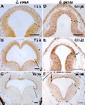 Figure 7. Development of early fiber tracts in the brain of E. coqui (A-C) and D. pictus (D-F) as revealed by immunohistochemistry for acetylated tubulin. Asterisks indicate the optic stalk in all panels. A, D: The tract of the postoptic commissure and its associated commissure are the first fiber tracts to form in the embryonic forebrain of both species (boxed area in A is shown at a more lateral level of focus). B, E: At midembryonic stages, a more complex scaffold of tracts has formed. C, F: Camera lucida drawings of embryos with all major fiber tracts indicated. In E. coqui, fibers run ventrad along the lateral surface of the thalamus, but no dorsoventral diencephalic tract of tightly bundled fibers is observed (indicated as DVDT ?). Abbreviations: AC: anterior commissure; Cer: cerebellum; CPT: commissure of the posterior tuberculum; DVDT: dorsoventral diencephalic tract; Ep: Epiphysis; HC: Habenular commissure; ITC: intertectal commissure; NII: optic nerve; NV: trigeminal nerve; NVII/VIII: facial and vestibulocochlear nerves; PC: posterior commissure; POC: postoptic commissure; Ret: retina (hatched circle); SOT: supraoptic tract; TAC: tract of the anterior commissure; THC: tract of the habenular commissure; Tel: telencephalon; TO: optic tectum; TCC: tract of the cerebellar commissure; TCPT: tract of the commissure of the posterior tuberculum; TPC: tract of the posterior commissure; TPOC: tract of the postoptic commissure; TV: descending tract of the trigeminal nerve; TVTC: tract of the ventral tegmental commissure; TVIII: descending tract of the vestibulocochlear nerve; VLT: ventral longitudinal tract. Bar: 100 μm in all panels. |