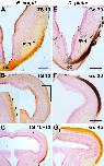 Figure 4. Cell proliferation during tectal development in E. coqui (A-C) and D. pictus (D-F) as revealed by immunostaining for proliferating cell nuclear antigen (PCNA) in transverse paraffine sections. The border of the optic tectum is indicated on the right side of each panel. Tectal layers are identified by numbers in panels C and F. At early embryonic stages of both species (A, D), the optic tectum is very small and all tectal cells are PCNA immunoreactive (orange or brown nuclei). At later embryonic stages (B, E), the tectum of E. coqui has enormously grown in size, while the tectum of D. pictus is still small (note different magnification). While the entire ventricular layer remains PCNA immunoreactive, the first non-proliferating cells are evident (arrows). At hatching, the tectum of E. coqui (C) resembles the tectum of D. pictus at an early larval stage (F): tectal layers 5 and 7�9 have differentiated, while PCNA immunopositive cells continue to be present along the entire ventricular surface. Bar: 100 μm in all panels. |