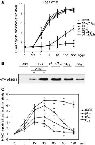 Figure 2. ATM activation by different DNA structures. (A) Histone H2AX carboxy-terminal peptide phosphorylation in the presence of increasing amounts of rDSB, pA70/pT70, pT70, pA70, M13 circular ssDNA or pT70 plus 100 μM aphidicolin (Aph). Activity was measured 15 min after incubation of DNA in the extract at 22°C and is expressed as fold induction over the activity measured in the untreated extract. (B) ATM serine 1981 phosphorylation in the untreated (âDNA) egg extract or extract supplemented with rDSB in the absence or presence of 10 μM Ku55933 (ATMi), 2.5 ng/μl pA70/pT70, pT70 or pA70 or after 30 min of incubation. Western blot was performed with Advance ECL for enhanced sensitivity. (C) Histone H2AX peptide phosphorylation in the presence of egg extract containing no DNA, 2.5 ng/μl rDSB, pT70 or 25 ng/μl pA70 and R70 measured at the indicated time points after DNA addition. Activity is expressed as fold induction. In all graphs, the values are average of three independent experiments and the error bars represent standard deviation.