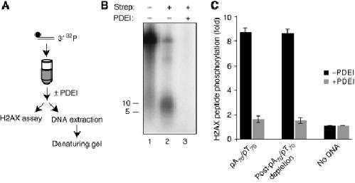 Figure 3. ssDNA oligos sustain ATM activity. (A) Experimental procedure: biotinylated pA70/pT70 labelled with 32P on the 3â² end was incubated for 30 min in the extract and then removed with streptavidin beads. After pA70/pT70 removal, histone H2AX peptide phosphorylation was monitored. (B) Residual DNA left in the extract was isolated and run on a 15% TBEâurea denaturing gel. DNA was isolated from the extract incubated with biotinylated and labelled pA70/pT70 for 30 min (lane 1) and from extracts in which biotinylated pA70/pT70 was incubated for 30 min and then removed with streptavidin beads (Strep) (lanes 2 and 3). The extracts were untreated (lane 2) or supplemented with 0.001 U/μl PDEI (lane 3). (C) Histone H2AX peptide phosphorylation induced by 5 ng/μl biotinylated pA70/pT70 before and after pA70/pT70 removal in the absence (black bar) or in the presence (grey bar) of 0.001 U/μl PDEI. PDEI was added 30 min after DNA addition and was incubated for 10 min at 22°C. Activity is expressed as fold induction over the untreated extract (no DNA).