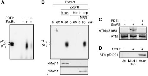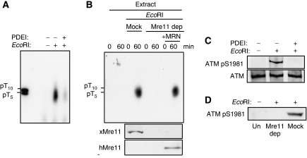 Figure 5. ssDNA oligos are generated from MRN-dependent processing of chromosomal DSBs. (A) Sperm nuclei were incubated in the extract for 30 min. The extract was then supplemented with 0.2 U/μl of EcoRI in the presence or absence of 0.001 U/μl of PDEI and the samples were incubated for a further 60 min. Sperm nuclei were permeabilized and processed to isolate soluble low molecular weight DNA. DNA was labelled with TdT in the presence of 32P-alpha-ddATP and ran on a 15% TBE–urea denaturing gel. (B) Upper panel: sperm nuclei were incubated in the extract for 30 min, after which the extract was supplemented with 0.2 U/μl EcoRI and immediately processed to isolate low molecular weight DNA (0 min) or incubated for a further 60 min. The extracts were untreated, mock depleted (mock) or Mre11-depleted (Mre11 dep) and supplemented with recombinant MRN complex (+MRN) (250 nM). Lower panels: egg extract treated as indicated in the upper panel was probed with anti-Xenopus (xMre11) and anti-human Mre11 (hMre11) antibodies. (C) Sperm nuclei were incubated in the extract in the presence or absence of 0.2 U/μl of EcoRI or 0.001 U/μl of PDEI for 60 min. ATM was immunoprecipitated and immunoblotted as indicated. (D) Sperm nuclei were incubated in the extracts that were untreated (Un), mock depleted (mock) or Mre11 depleted (Mre11 dep) in the presence or absence of 0.2 U/μl of EcoRI for 60 min. ATM was immunoprecipitated and immunoblotted as indicated.