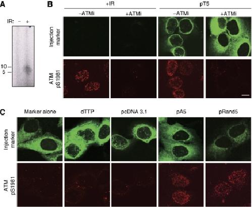 Figure 6. ssDNA oligos are generated following induction of DSBs in human cells and promote ATM activation when injected in undamaged cells. (A) Human U2OS cells were irradiated with 10 Gy of IR. Following a short recovery, cells were permeabilized and processed to isolate soluble low molecular weight DNA. DNA was labelled with TdT in the presence of 32P-alpha-ddATP and ran on a 15% TBE–urea denaturing gel. (B) U2OS cells were co-microinjected with 5 μg/μl pT5 and anti-goat IgG conjugated with Alexa Fluor 488. After 30 min incubation, cells were fixed and stained with anti-ATM phospho-serine 1981 antibody. Where indicated cells were treated with 10 Gy of IR and after 1 h were fixed and immunostained. The ATM inhibitor (ATMi) was used at 10 μM for 1 h prior to irradiation or microinjection. (C) U2OS cells were injected as indicated. All DNA concentrations were at 5 μg/μl and dTTP was 100 μM. After 30 min incubation, cells were fixed and stained with anti-ATM phospho-serine 1981 antibody. All the images were acquired under identical microscope settings. Scale bar is 10 mm.