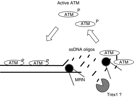 Figure 7. Proposed model for ssDNA oligo action. ssDNA oligos generated by MRN-dependent processing of DSBs stimulates ATM activity by forming MRN–DNA oligo complexes. Elimination of ssDNA oligos by single-stranded DNA exonucleases such as Trex1 (see Discussion) might indirectly control ATM activity.