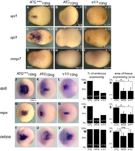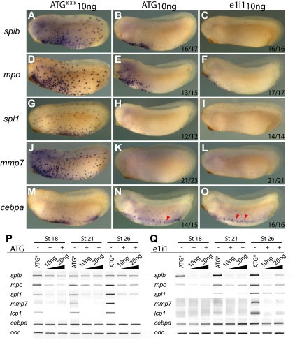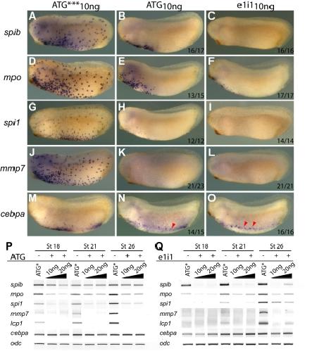 Figure 5. spib is necessary for primitive myeloid differentiation. spib-depleted embryos show absence or reduced expression of mpo, spi1, and mmp7 but not cebpa. (A-O) WMISH and (P,Q) RT-PCR analysis on spib ATG and e1i1 morphants. ATG*** is a 3-mismatch ATG morpholino. (P) spib ATG morpholino reduces but does not eliminate all spib transcripts, (Q) whereas spib e1i1 morpholino eliminates functional spib mRNA at 10 ng. (A-F) Severe reduction on the number of spib- and mpo-expressing cells and (J-O) marked absence of spi1 and mmp7 expression on spib morphants. (G-I) Under the same experimental conditions, cebpa-expressing cells are not affected. All embryos are shown in lateral views with anterior to the left. The number of representative embryos is shown at the bottom right corner of each panel. |
