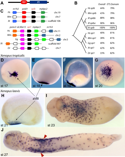 Figure 1. Xenopus spib identification. (A) Conserved protein motifs in spib and spi1; the PEST degradation domain and ETS DNA-binding domain. (B) ClustalW tree alignment on vertebrate spib and spi1 protein sequences and percentage identity over their entirety and DNA-binding domains. (C) Genome organization around the known vertebrate spib and spi1 genes, showing synteny between various vertebrate genomes. Genes shown in the same color represent putative orthologous genes. Expression pattern of Xenopus tropicalis spib and (D-G) Xenopus laevis spib paralogs (SpiBa and SpiBb, H-J) is indistinguishable and marks a population of primitive myeloid progenitors in the anterior ventral blood islands (aVBIs). spib expression is transient and first detected at stage 17. (F) Cleared embryo shows only mesodermal expression, and (J) spib expression is eventually down-regulated after spib-expressing cells associate with vitelline veins (arrowheads). Anterior is to the left, and dorsal to the top in all lateral views; panels D, G, and I,J represent ventral views. The following database sequences were used: Hs spib Q01892, Mm spib O35906, Xl spiba BC046671, Xl spibb BC130210, Xt spib IMAGE 7023083, Hs spi1 P17947, Mm spi1 P17433, Gg spi1 NP_990354, Xt spi1 BC098077, and Dr spi1 CAD58735 (outgroup NP_001008139 and P14921). |