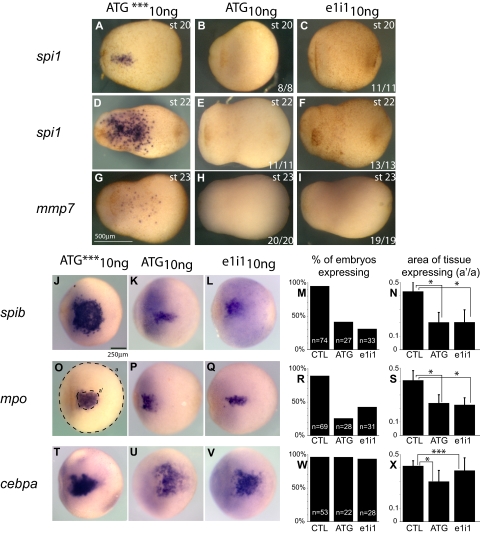 Figure 6. Effect of spib knockdown in primitive myeloid progenitors. (A-I) Primitive macrophages defined by the expression of spi1 and mmp7 are absent from spib-depleted embryos. (J-L,O-Q,T-V) WMISH analysis of aVBI in spib morphants; at the earliest point we can identify a pool of primitive myeloid progenitors by the coexpression of spib, mpo, and cebpa. (M,R,W) Quantification of the number of embryos that express spib, mpo, and cebpa and (N,S,X) size of primitive myeloid progenitor pool, by the area of tissue-expressing progenitor markers. Error bars represent the SD of the number of embryos analyzed (n). (O) Amount of tissue was calculated using area ratios of a and aâ². Similar results were obtained in either ATG or e1i1 morphants and are in contrast with the uninjected and ATG mismatch control group (CTL). Student t test P values lower than .001 are marked as * and considered statistically significant; P values higher than .05 are not statistically significant and marked as ***. |