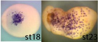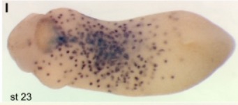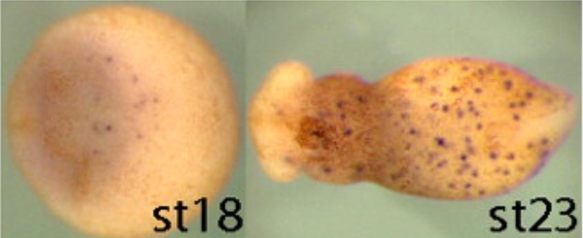 sbi1 (Spi-1 proto-oncogene) gene expression in Xenopus tropicalis embryo, assayed via in situ hybridization, NF stage 20 ( left) and NF stage 23 (right), ventral view, anterior left.