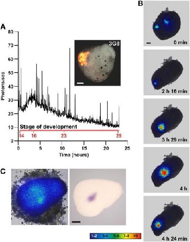 Fig. 5. The expression of XSMP-30 correlates with domains of Ca2+ transients. (A) The pronephric territory was isolated from late gastrula aequorin-injected embryos and cultured in Steinberg's solution until sibling control embryos reached stage 29. A representative example of a PMT trace (n = 7) obtained from an aequorin-loaded explant (integration time 30 s). Light emission, expressed in photons per second and reflecting changes in [Ca2+]i, starts just prior to stage 14. Differentiated pronephric tubules can be visualized with the tubule-specific monoclonal antibody, 3G8 (see inset panel; scale bar is 100 µm). (B) Representative example (n = 3) of the spatial distribution of a sequence of Ca2+ transients that occur over a period of  4.5 h after stage 14. Each aequorin-generated image represents 120 s of accumulated light. These have been superimposed on to the corresponding bright-field images of the explant. Color scale indicates luminescent flux in photons/pixel. Scale bar is 100 µm. (C) Accumulated increase in [Ca2+]i during 6 h of data acquisition, which was superimposed on the bright-field imaged grabbed at the end of acquisition (left panel). In the same explant, the expression pattern of XSMP-30 was determined at stage 34 by in situ hybridization (right panel). The domain of gene expression is located within the domain of high Ca2+ signals. Scale bar 100 µm.