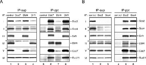 Figure 3. Cdc7-kinase complexes physically associate with Scc2âScc4. (A) IP was performed with control (lanes 1,5), anti-Cdc7 (lanes 2,6), anti-Dbf4 (lanes 3,7), or anti-Drf1 antibody (lanes 4,8) from LSS. Supernatants (IP-sup; lanes 1â4) and immunoprecipitates (IP-ppt; lanes 5â8) were probed with the indicated antibodies. (*) Cross-reacting band. (B) IP was performed with control (lanes 1,4), anti-Scc2 (lanes 2,5), or anti-Scc4 antibody (lanes 3,6) from LSS. Supernatants (IP-sup; lanes 1â3) or immunoprecipitates (IP-ppt; lanes 4â6) were probed with the indicated antibodies. (*) Cross-reacting band. |