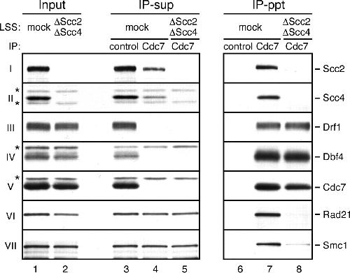 Figure 4. Cdc7 and cohesin associate via Scc2âScc4. LSS was depleted with either control (lanes 1,3,4,6,7) or a mixture of Scc2 and Scc4 antibodies (lanes 2,5,8). IP from the resulting LSS was performed with control (lanes 3,6) or Cdc7 antibody (lanes 4,5,7,8). Input (lanes 1,2), supernatants (IP-sup; lanes 3â5), and immunoprecipitates (IP-ppt; lanes 6â8) were probed with the indicated antibodies. (*) Cross-reacting band. |